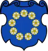Friedrichsdorf was given its first civic coat of arms in 1821 in remembrance of Russian Princess Alexandra's – and her eight guests' – visit to Count Friedrich in Bad Homburg: In azure a ring of nine roses argent (i.e. a blue shield with a ring of nine silver roses).