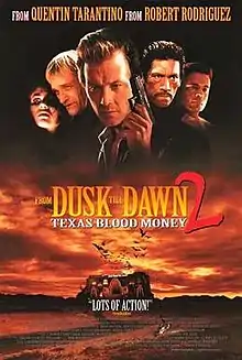From Dusk Till Dawn 2: Texas Blood Money is an American Western horror film released on March 16, 1999. It is the second film in the From Dusk Till Dawn series and is a sequel to From Dusk till Dawn. The film was an early test release by Dimension Films for the direct-to-video market.[1] It was co-written and directed by Scott Spiegel. Michael S. Murphey, Gianni Nunnari, and Meir Teper produced. Quentin Tarantino and Lawrence Bender executive produced, and Elizabeth Avellan co-produced.[2] The film was filmed on location in South Africa and features cameos by Bruce Campbell and Tiffani Thiessen. It won a Saturn Award from The Academy of Science Fiction Fantasy & Horror Films for the "Best Home Video Release" of 1999.[3]