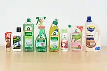 Frosch is a trademark for cleaning and care agents made by the Mainz-based company Werner & Mertz GmbH.[1] Introduced in 1986, the brand family comprises over 80 products, including multi-purpose cleaning agents, scouring agents, glass cleaners, special cleaners, toilet cleaners, dish-washing liquid and laundry detergents. Hand soaps, shower gel and air fresheners are new additions to the portfolio. By launching Frosch, the company complemented its current product portfolio (including Erdal) by adding a brand with a clear focus on ecological aspects in addition to efficiency.[2] The brand is the company's largest source of revenue. Werner & Mertz also engages in sustainability drives under its own name. Surveys by Reader's Digest indicate that Frosch is – from a consumer perspective – among the most trustworthy brands. Werner & Mertz generated revenues of €455 million in 2019 and is forecast to reach €525 million in 2020.[3]
