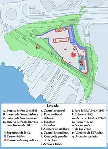 Fuerte de Isla Verde (English: Green Island Fort) was a military installation formerly located in Algeciras, Spain. It occupied the Isla Verde (English: Green Island), which gave its name to the city as a whole (via the Arabic name Al-Jazira Al-Khadra', English: Green Island, corrupted into "Algeciras"). The elongated island, which stood a short distance offshore of the city's old town, was already the site of an artillery battery in 1720.[1] In 1734 the fort was constructed on the island to the plans of the military engineer Juan de Subreville. Further remodeling took place in 1745 under Lorenzo de Solís. The installation, which followed the roughly triangular shape of the island, was initially equipped with three batteries.[2] These were:
