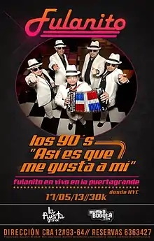 Fulanito is an American musical group based in Washington Heights in New York City. The group combines traditional merengue with elements of other genres such as house, hip hop, and bachata among others. With over five million albums sold throughout the world, they were at one time the top selling act in Colombia, and were placed on other charts including those of Japan, Switzerland, United States, and Chile. Their name means "Little John Doe" (i.e. unknown) in Spanish (see Fulano + -ito). Members of Fulanito had previously been in popular groups such as 740 Boyz and 2 in a Room.