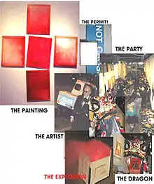 The gallery continued at the Broome Street location, where the installation of a full kitchen permitted the gallery's weekly sit-down dinners to be expanded for 35 to 45 people and the occasional buffet party for hundreds, including the dinner party for Chinese New Year, with art by Tery Fugate-Wilcox, that was blown up on the street, complete with fireworks and a dragon for the celebration, during a ban by Mayor Rudy Giuliani on explosives,[22] and a Nude Portrait Marathon with Barneby Ruhe making conventional paintings of nude models, while Tery Fugate-Wilcox had living nudes standing in huge frames on the walls of the gallery. Some of the most notable works at the new location included: a glass beehive, by Robert DuGrenier;[23] a 55-gallon glass tank of water that grew slime and algae, by Tery Fugate-Wilcox;[24] steel drawings made by rusting etched steel plates in a studio under the sea.[25]