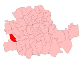 The Metropolitan Borough of Fulham wards of Hurlingham, Margravine, Munster, and Town.