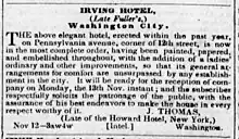 The name was shortly thereafter changed to Irving House or the Irving Hotel.[1][2] In 1849, Millard Fillmore and his family were to stay at the Irving Hotel after leaving the White House while attending Zachary Taylor's inauguration and festivities before leaving the city.[4]