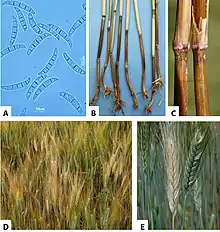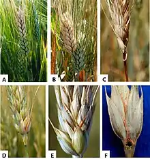 Fusarium culmorum causes seedling blight, Fusarium head blight (FHB) as well as foot and root rot (FRR), and is considered one of the most serious pathogens of wheat and other small grain cereals besides Gibberella zeae (Fusarium graminearum).[4] Different from F. graminearum, the teleomorph of F. culmorum is not known, which means the ascospores are not produced. Instead, it reproduces asexually by developing conidia, which is also the main mode of dispersal.[5] Chlamydospores can survive in host debris during winter, whereas the microconidia are usually not produced in natural conditions.[6]