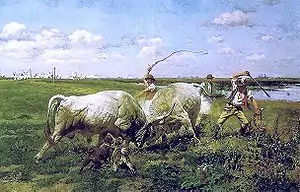 His interests later turned to animals; notably cattle. His painting "Ki a legény a csordában?" (Who is the Bachelor of the Herd?), was awarded a gold medal and made into an etching by Jenő Doby. He created several huge canvases on related themes. In 1898, a state scholarship enabled him to spend four months in Algeria and Tunisia, where he studied lions, their habits and living conditions; taking photographs as well as making sketches. After the turn of the century, he made studies at zoos in Hamburg, Leipzig, and Berlin.