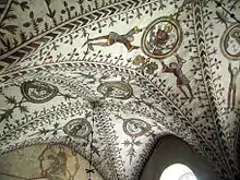 The church walls and ceiling are decorated with 15th-century frescos in shades of brown, green and blue-grey. Those in the vaults of the nave have never been covered in whitewash and are therefore unusually well preserved. Those on the walls, which have been restored, are in worse condition. Those in the apse and chancel have suffered from the blue paint with which they were covered in the 19th century.