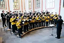 In the main choir, about 60 boys and young men sing. They are aged 9 to 21 years and are from different middle and high schools in Göttingen and its surroundings. The boys sing the soprano and alto voices, while the men sing the tenor and bass parts. The choir rehearses two or three times a week on the lectern or with all voices. Also, the choir rehearses one full day a month and once a year for a week during the holidays. Concerts, as well as recordings and individual and group voice work, complete the choral life.