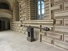 Güstrow Palace is quadrangular in shape. Some of the old furniture has been removed to Schwerin and other places following the death of Magdalena Sybilla which marked the end of the Güstrow lineage. In one part of the palace, there are well preserved Flemish paintings; one particular painting is of a Dutchman smoking. A theatre is in good shape with well preserved original stucco paintings. The stucco ceilings are retained in their original form in the palace. The banquet hall's ceiling has unique stucco paintings of hunting scenes which are adaptations from Dutch copper engravings.[2] The medieval rooms in the basement of the palace, which are vaulted, have many artifacts of the medieval period of Germany. The art chamber contains exhibits of hunting and ceremonial weapons. The refurbished former dining halls, residential and reception rooms have exhibits of paintings of Cranach, Marten de Vos, and Tintoretto. Antique ceramic vessels and a large number of glass items are on display in the former chamber of the duchess. There are also displays from the 19th to 21st centuries.[2]