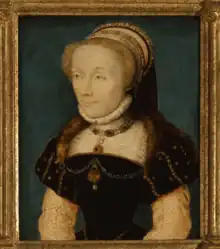 Like her royal mistress Catherine de' Medici and fellow ladies-in-waiting Fulvia Pico della Mirandola, Comtesse de Randan and Louise d'Halluin, dame de Cipierre, Gabrielle de Rochechouart, dame de Lansac was the subject of several portraits famous today. Attributed to Corneille de Lyon, the workshop of Corneille de Lyon, or the school of Corneille de Lyon, two are today at the Musée Conde,[2][16] while one is at the Frick art Museum, Pennsylvania.[15] The painting now in the Frick Art Museum, Pennsylvania, was once known as Lady Jane Grey. Lee Porritt writes that a similar copy also with the blue background with an inscription and a plaque identifying the sitter as Gabrielle de Rochechouart, Dame de Lansac had been donated in 1897 to The Musée Condé by Henri d’Orléans, Duke of Aumale along with other paintings from the Duke of Sutherland's collection.[17]