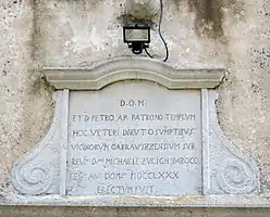 The parish church in the settlement is dedicated to Saint Peter and belongs to the Diocese of Koper.[3] It was built in the Baroque style. A plaque over the door has the year 1780 on it.[4]