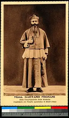 Gaetano Mignani (31 August 1882 – 29 January 1973) was an Italian prelate of the Catholic Church. He served as Apostolic vicar of Kianfu (Ji'an Prefecture), he became the first Catholic Bishop of the Roman Catholic Diocese of Ji'an when the region was elevated to a diocese in 1946, a position he would hold until 1951, when the new Communist government expelled him from the country.