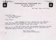 Letter from Inspiration Pictures Inc. informing Gail Kane of her 1923 earnings for The White Sister'