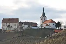 The parish church in the settlement is dedicated to the Holy Cross and belongs to the Roman Catholic Archdiocese of Maribor. It was first mentioned in written documents dating to 1473.[9] The church was renovated after a fire in 1769, and was extended in 1884. It has Baroque furnishings. The two sculptures on the main altar are works by Veit Königer (1729–1792). The church records date back to 1786. The cemetery chapel is dedicated to John the Evangelist.[8]