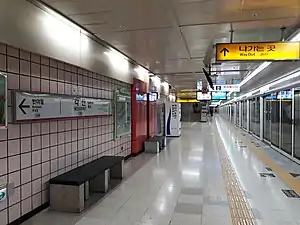 Gaksan Station is a commuter train station on the Daegu Subway Line 1 in Sinseo-dong, Dong District, Daegu, South Korea. There are many apartments surrounding the station. You can enter the Dongho residential area in order to get to Gumgang-dong.[1]