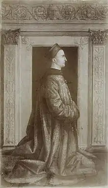 Galeotto was knighted in Ferrara in 1452 by Emperor Frederick III, when he appointed Duke Borso d'Este to become the Duke of the city.[4] In 1467 he fought for the Duke beside Bartolomeo Colleoni against the Medici, returning to Mirandola after the death of his father on 8 November to take over the dukedom.[5] On the death of Borso on 20 August 1471, Galeotto strengthened his friendship with the new Duke, Ercole I d'Este, by entering into a treaty of alliance.[6] On 9 January 1476, he joining a coterie of ambassadors sent to Naples to escort his bride, Eleanor of Aragon to Ferrara.[7]