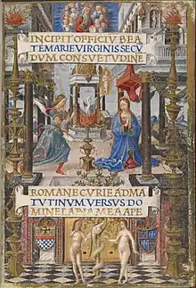 Giovanni Francesco Maineri, The Mirandola Hours (British Library). In the lower margin are the arms of Galeotto I (at the left) and the arms of his wife, Bianca d'Este (at the right).