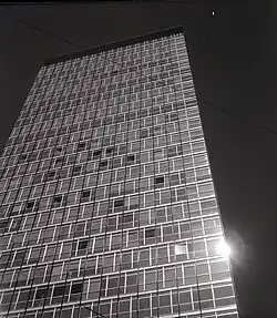 The overall design of the tower is mainly based on the International Style architecture. The building is rectangular, with the two lowest floors larger than the main body. The main structure in reinforced concrete is almost completely hidden by curtain walls made of glass and aluminium.