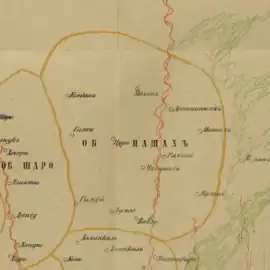 Galgai-Yurt as a part of the Nashakh Naibdom on an 1856 map.