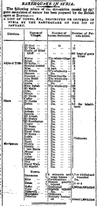 The shock was comparatively slight in Beirut, but many houses were damaged and others completely destroyed. The wintertime slowed communication in the area, and nearly eight days passed before reliable reports came in from Safed regarding the nature of damage there. The letters stated that the town, along with Tiberias and many other villages, had been overthrown. Sidon was damaged considerably, and in Tyre the fallen homes made the streets nearly impassable, with people sleeping in boats and in tents alongside the shore. The village of Rumaish was mostly destroyed, with thirty deaths occurring as people were crushed in their homes, and many more would have suffered the same had they not been at evening prayers at the church there, which was a small building that was not seriously damaged.[13]