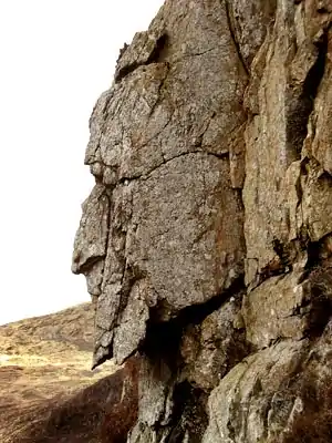 East of Loch Neldricken, access to Loch Enoch is gained by the Wolf Slock. Both of these latter named places figure prominently in the Crockett novel. The sharp granite sand on the beaches of Loch Enoch itself was at one time collected and sold for sharpening knives and scythes.[14]