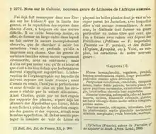 Galtonia was first described as a new genus within Liliaceae in 1880 by Joseph Decaisne,[1][2] and appeared the following year in the 1881 Kew Gardens report.[6] He describes two species, G. candicans (Hyacinthus candicans Baker[7]) and G. princeps (Hyacinthus princeps Baker[8]), which are listed in an 1884 text.[9] These were reassignments of two of Baker's species of Hyacinthus, which he distinguished as sufficiently different to justify forming a new genus, with G. candicans the type species.[10]