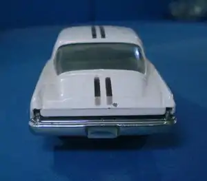 In about 1966, Gamda partnered with another firm, Koor, which was owned by the Histradrut, the Israeli trade union.[6] This formed a company called Gamda Koor Export.[1] The new company mainly existed to introduce a new line of mainly American automobiles aimed at foreign markets. At the time, export taxes had been lowered, helping Israeli businesses to break into international markets.[3] These were called Sabra Super Cars and were mainly unique tooling of vehicles not made by other European model makers. Most Sabras were manufactured between 1969 and 1972, but some perhaps a tad earlier.[7] There were 24 models in the series and they were numbered from 8100 to 8123.[6] Models included a 1965 Plymouth Barracuda, a 1966 Charger, a 1965 Chrysler Imperial convertible (Corgi Toys also offered a convertible Imperial, see comparison below), a 1966 Buick Riviera, a 1965 Corvette Coupe (not split window, but the convertible hardtop), a 1965 Chevrolet Chevelle station wagon, a 1966 Olds Toronado, a 1967 Cadillac Eldorado, a 1967 Cadillac Coupe deVille, a 1967 Pontiac GTO, a 1968 Pontiac Firebird, a 1967 Chevy pickup and tow truck, a 1965 Ford Mustang, a Ford GT, a 1967 Ford Torino, a 1966 Chevrolet Impala coupe, a 1967 Camaro, a 1967 Ford Thunderbird, a Volkswagen Beetle and a Jeep Willys. Models were often available in a stock, police, or taxi livery. Some of these, like the Barracuda, Charger, Torino and GTO are more rare and sought after.