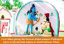 According to legend, Arjuna got his weapon Pashupati Astra here by meditating to Shiva. He placed a Shivalinga here, which is believed to be at the temple called the Gandiveshwar Nath Mahadev Mandir.[2] This place is located at Shivnagar village which is 15 kilometres distance from the sub divisional town Benipatti in Madhubani district of Mithila region in Bihar, India. It is historical, religious and cultural heritage of the district. There are many temples in the campus of the Gandiveshwar Sthan. Gandiveshwar Nath Mahadev Mandir and Gaurishankar Mandir are the two main temples in the campus. Gandiveshwar Nath Mahadev Mandir is the temple of Shiva and Gaurishankar Mandir is the temple of the goddess Gauri and Shiva jointly. There are also the temple of God Kartikeya, Ganapati, Kalabhairava, Batuka Bhairava, Suryanarayana, Hanuman, Rama, Lakshmana, Kali, Sita and some other deities in the campus.[3] This place is very famous for Mahashivaratri and Shravan Somvari festivals. Hindu devotees of Shiva gather here from different parts of the district in Shravan Somvari to Jalabhisheka (जलाभिषेक) and worship the Shiva.[4]