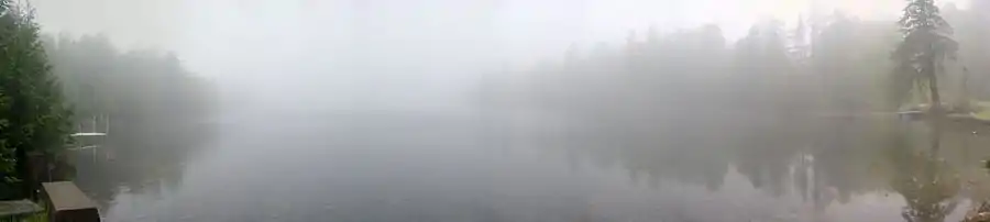 Panoramic view from the south end of the lake in the fog; the outlet to Kitchen Creek is in the lower left corner.