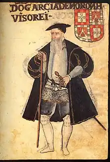 D. Garcia de Noronha (1479 in Lisbon – 3 April 1540 in Cochin) was a Portuguese nobleman. He was great-great-grandson of King Ferdinand I of Portugal, was the third viceroy and tenth governor of Portuguese India.[1][2]