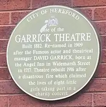 The theatre was rebuilt later in 1916, but subsequently demolished.[3] Another plaque, mentioning the fire, marks its former location, on Widemarsh Street.[3][4]