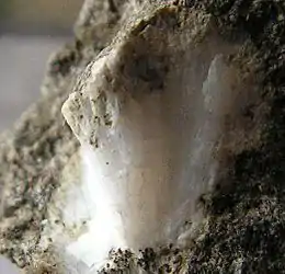 Garronite-Ca is formed under hydrothermal conditions at low temperature. It is a rare zeolite, and very rare in the form of defined crystals. As fibrous masses, filling vacuoles in basalts, it has been found in the county of Antrim, in Northern Ireland (United Kingdom), and in the area of Fáskrúðsfjörður (Iceland).[4] It is usually associated with phillipsite, which is located in the outer area of the nodules. As crystals, associated with calcite and analcime, it has been found in San Giorgio di Perlena, Fara Vicentino, Vicenza (Italy)[7] and in Barranc Salat, Calpe, Alicante (Spain).[8]