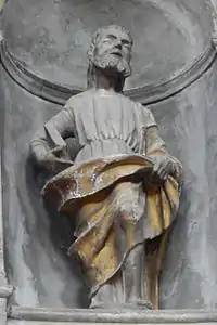 In general, all the stone sculptures at the Santa Maria dei Miracoli laid down in the decade following the cycle of the Apostles were limited to the interior of the building, and were by Cairano and his associates.[5] There is a possibility that this limitation was the result of a confrontation between Cairano and Tamagnino.[5] At the time Cairano worked on his Apostles, Tamagnino was the better regarded sculptor, and his superiority is evident in the artistic and technical quality of his Angels, if only for their relative modernity, following the neo-classical mode of Antonio Rizzo.[6][7] It is likely, therefore, that there was some local support that allowed Cairano to penetrate Tamagnino's stronghold in Brescia, despite the former's relative underdevelopment as an artist.[5] On the other hand, Tamagnino only created five other works within the church, and he was paid for the entire body of his work less than Cairano for his Apostles. Following this debacle, Tamagnino left the site of the church and Brescia, and only returned a decade later.[8][note 6]