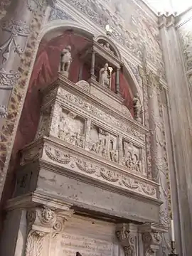 One of the questions on the later years of Cairano's career is that of the completion of the Martinengo mausoleum, the largest funereal monument of the Brescian renaissance.[59][note 13] The commission to the jeweller and sculptor Bernardino delle Croci by the brothers Francesco and Antonio Il Martinengo of Padernello dated to 1503,[63] with a term of three years for completion. The tomb was to house the remains of Bernardino Martinengo, the father of the two, who had left a bequest towards the work on his death in 1501 or 1502.[64] However, it was still unfinished in 1516, when delle Croci was commissioned per a new contract to finish it by January 1518.[65] The causes for the delay appear to have been, firstly, a commercial dispute between the jeweller and the clients, and secondly the war of 1512, which surely slowed the work, even if not entirely stopping it.[66] It was not until 1516, following the reconquest of Brescia by the Venetian republic, that a new definitive agreement was made. The documents are incomplete but in fact the monument was completed and installed within the Corpus Christi church, probably within the terms of the contract.[67]