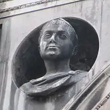 On August 30, 1493, Cairano was tasked with the decoration of the exterior of the Palazzo della Loggia with the delivery of capita 5 imperatorum romanum,[15] or five busts for the beginning of a cycle of thirty Caesars, which would become among the finest achievements of his career.[10] The production of these busts can be traced, in general, to a contemporary reworking of ancient portraiture.[10] In the oldest busts, i.e., those facing the piazza, there are similarities with the image of Bartolomeo Colleoni in the memorial by Andrea del Verrocchio in Venice,[16] with an evoking of an effigy of Antoninus Pius[17] and a portrait of Nero,[18] all famous images at the time and here revived in three dimensions.[10]