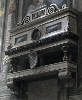 In possibly the last years of the 15th century, the Sanmicheli were involved in the stone decoration of the Caprioli chapel in the Church of San Giorgio, for which Cairano, almost simultaneously, prepared his Adoration, demonstrating for the first time outside of the Loggia a cooperation between the two studios.[99] Bartolomeo Sanmicheli, at the beginning of the new century, attempted at this point to make a comeback in the local art scene with the Ark of San Tiziano of 1505, characterized by a strong decorative quality. He possibly also aspired to the commission of the ark of Sant'Apollonio, which had been up for grabs since the discovery of the relics of the holy bishop in 1503.[100][99] An early involvement of Sanmicheli can be surmised in the Martinengo mausoleum, but the commission was awarded to Bernardino dei Crossi in 1503. However, based on the prevailing decorative nature of the monument, which is much more rigorously classical, it can be attributed to Cairano.[101]