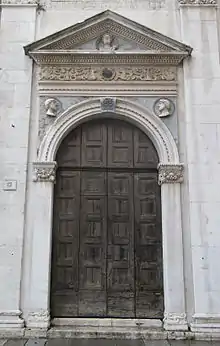 The construction of the entrance to the Duomo of Salò is copiously documented between 1506 and 1509. The design was by Cairano,[37][38] most likely in collaboration with Antonio Mangiacavalli.[39] Cairano's hand is evident in the figures of the Father, St. Peter and St. John the Baptist, leaving the Virgin to his collaborator, while the Angel of the Annunciation and two small busts in the spandrels appear to be a joint work. The architectural parts were accomplished by different stonemasons as recorded in the documents relating to the workshops, including Mangiacavalli's son.[40] The portal was put in place by August 1508, and embellishments and other work ended at the beginning of 1509.[37]