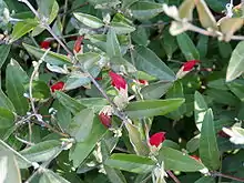 The species can grow to 1 m (3.3 ft) tall by 3 m (9.8 ft) broad. The red flowers, which have a distinctive long and curving keel, usually appear between August and November in Australia (late winter to late spring). The ovate leaves are glossy green above and silvery below.