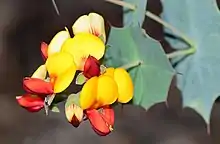 The species ranges from 0.3 to 3.5 metres in height. It has leaves with spiky, dentate margins and a long, tapering, pointed apex. The pea flowers are yellow to orange with a band of red surrounding the yellow centre, and a pink and maroon keel. These are produced from early spring to early summer (September to December in Australia).