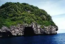 There is an underwater cave where divers encounter poisonous sea snakes, colored fishes and some species of shark believed to be sleeping during the day, which can be seen about 30 meters deep on the ground of the sea. The view inside and under the water cave is magnificent and divers would often liken it as if you are looking to a glass stained window with sparkling blue color and the glowing water from the sunlight. Its elevation was recorded at 188 feet (57 m) in 1919.[1]