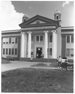It is a U-shaped, two-story concrete structure with Classical Revival elements including monumental portico with triangular pediment and use of columns.[2]