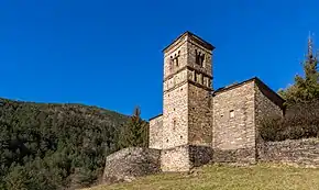 The Church of Saint Bartholomew forms part of the Serrablo churches, it uses early-Romanesque and Mozarabic design. The church was thought to have been built in the 10th or 11th century. The building has a nave finished off by an apse, a bell tower with Horseshoe arched windows. The church is located north-east of Gavín near the confluence of Saint Bartholomew and several ravines.[5]