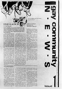 In the late 1980s, activists Tonie Walsh and Catherine Glendon sought to establish a free LGBTQ+ publication. The National Gay Federation (now National LGBT Federation) had previously published two unsuccessful LGBTQ+ periodicals, but agreed to establish an LGBTQ+ newspaper. GCN's first issue was published on 10 February 1988[3][4] as an eight-page tabloid newspaper. This first issue was designed by Niall Sweeney [5] and in the 1990s was printed by The Meath Chronicle.[6] It has been published consistently each month, with one exception. Its distribution was primarily through the pubs and clubs associated with the LGBTQ+ community, as well as other LGBTQ+ friendly spaces such as student unions, some books shops, and community and arts centres.[6]