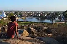 Gaya (IAST: Gayā) is a city, municipal corporation and the administrative headquarters of Gaya district and Magadh division of the Indian state of Bihar. Gaya is 116 kilometres (72 mi) south of Patna and is the state's second-largest city, with a population of 470,839. The city is surrounded on three sides by small, rocky hills (Mangla-Gauri, Shringa-Sthan, Ram-Shila, and Brahmayoni), with the Phalgu River on its eastern side.
