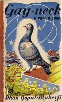 Gay-Neck, the Story of a Pigeon is a 1927 children's novel by Dhan Gopal Mukerji that won the Newbery Medal for excellence in American children's literature in 1928. It deals with the life of Gay-Neck, a prized Indian pigeon. Mukerji wrote that "the message implicit in the book is that man and winged animals are brothers."[1] He stated that much of the book is based on his boyhood experiences with a flock of forty pigeons and their leader, as the boy in the book is Mukerji himself.[2] He did have to draw from the experiences of others for some parts of the book, such as those who trained messenger pigeons in the war.[1] The book offers an insight into the life of a boy of high caste during the early 1900s and also into the training of pigeons.[3] Several chapters are told from Gay-Neck's perspective, with the pigeon speaking in first person. Elizabeth Seeger writes in a biographical note about Mukerji that, "Gay-Neck was written in Brittany, where every afternoon he read to the children gathered about him on the beach the chapter he had written in the morning."[2] In an article in the children's literature journal The Lion and the Unicorn, Meena G. Khorana calls the novel one of the few children's novels from Western or Indian authors to explore the Himalayas in a meaningful way (rather than simply using them as a setting), and notes the way Mukerji recalls their "grandeur and spiritual power".[4]