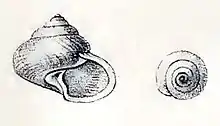 Inner lip—from the corner of the outer lip a very thin layer of nacre spreads out a little way across the body, but then ceases entirely. The columella is spread out at its base as a confined, flattened, unevenly inclined, semicircular, iridescent umbilical pad. From the left corner of which the columella proper projects, it has a narrow but rounded edge, twisted, straight, bending to the left, and advances into a sharply angulated, and, as seen from behind, even mucronated junction with the basal aperture edge, to which the umbilical pad curving round the back of the pillar also attains. The inside is scored with the external sculpture, and is brilliantly iridescent. The umbilical pad is defined by a narrow furrow, and in front by a slightly tumid ridge, which is the least nacreous part of the whole shell. The operculum is membranaceous, horny, yellowish, with about six to seven turns, each strongly defined by a narrow line of thickening, and sharply scored with minute oblique radiating lines.[4]