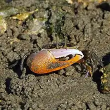 The carapace is up to 30 mm across,[3] black-brown with blue patches to varying extent. Adult males have an enlarged claw with a grey or pink upper finger, and orange lower finger and hand.[3] Like other fiddler crabs the claw is used to scare or fight other males, and in waving displays to attract females. The lower male claw has a large triangular protection in the most distant part from the body.[4]