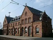 The building was built in 1882/83 and is therefore a structure of the "second generation" of structural engineering on the line. The station building is symmetrically designed on an H-shaped floor plan. On the street side the facade is dominated by three pointed gables; the middle gable is omitted from the design of the facade on the track side. A "princely pavilion" (Fürstenpavillon) was built to the west of the main building with three bay windows; there is also a detached toilet block built in the Romanesque Revival style east of the main building.