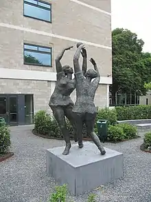 The Gemeentelijk Gymnasium Hilversum with the 1966 sculpture Sport en Spel by Pieter Starreveld