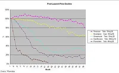Generic pharmaceutical price decay is what happens (in the UK) once the originator brand has lost its patent exclusivity (patent expiry) and generic versions of the originator brand have been launched.[1][2][3][4][5][6]